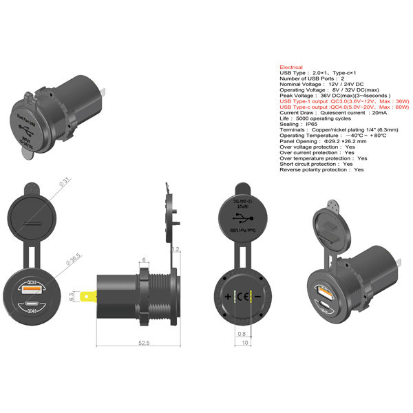 USB-A: QC3.0 3,6V - 12 Volt, Max 36W