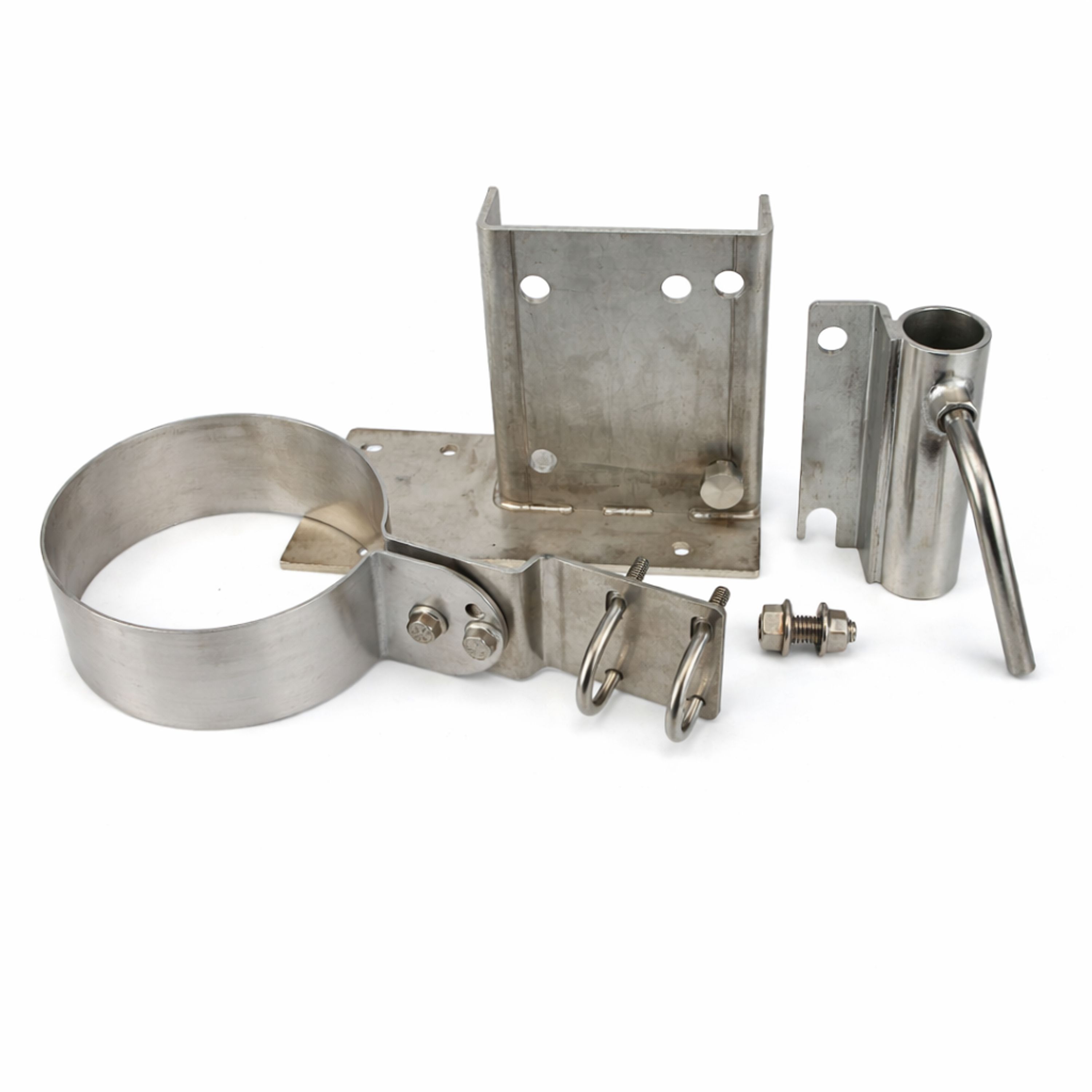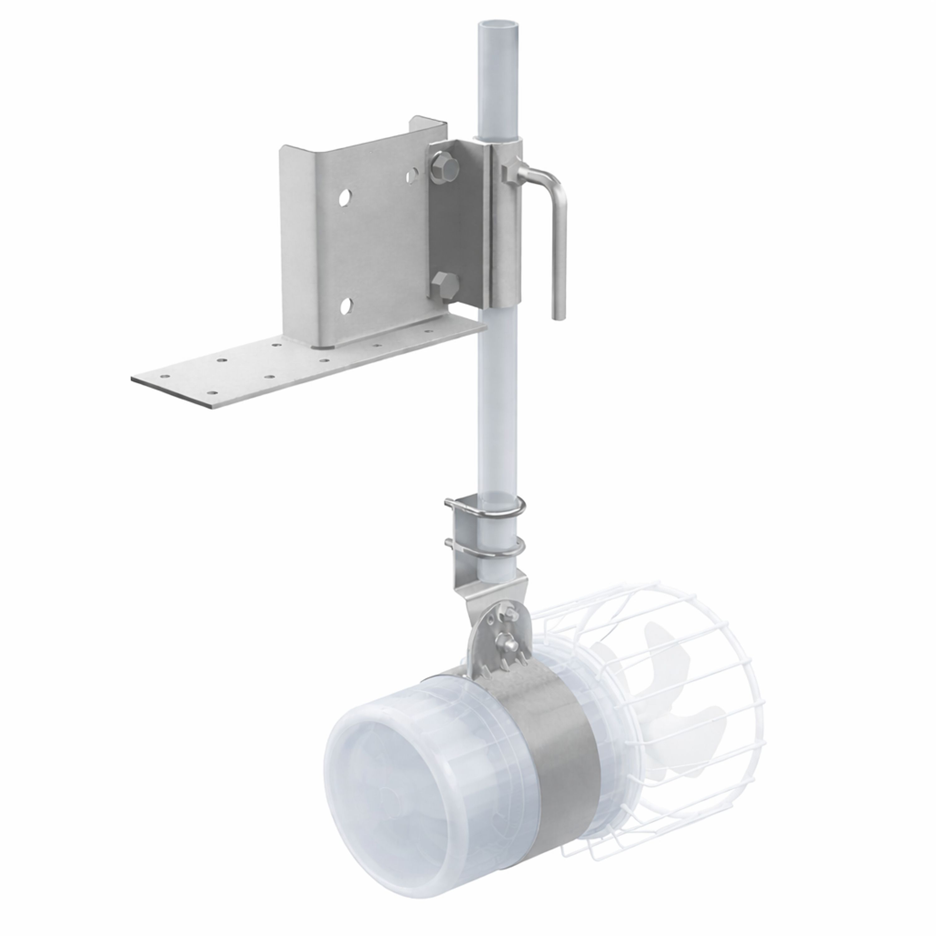 Fäste i galvaniserad stål för montering av Kasco De Icer vid brygga. Fästet kan vinklas från vertikalt till horisontellt läge, och vinkeln på De Icern kan också justeras.