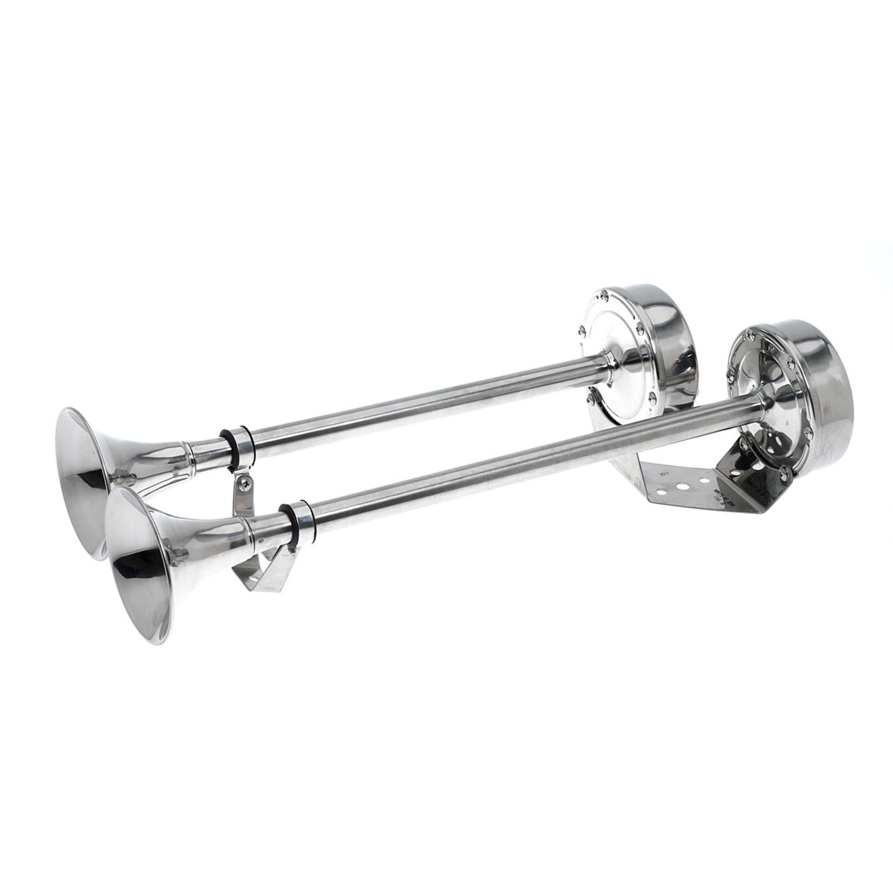 Helt i rostfritt stål. Hög och låg ton ger ett melodiskt ljud. Är en uppgradering av de flesta signalhorn. Utmärkt för saltvatten. Mått: L=470 mm, B=203 mm, H=127 mm. 12 V Ljud: 115±5dB